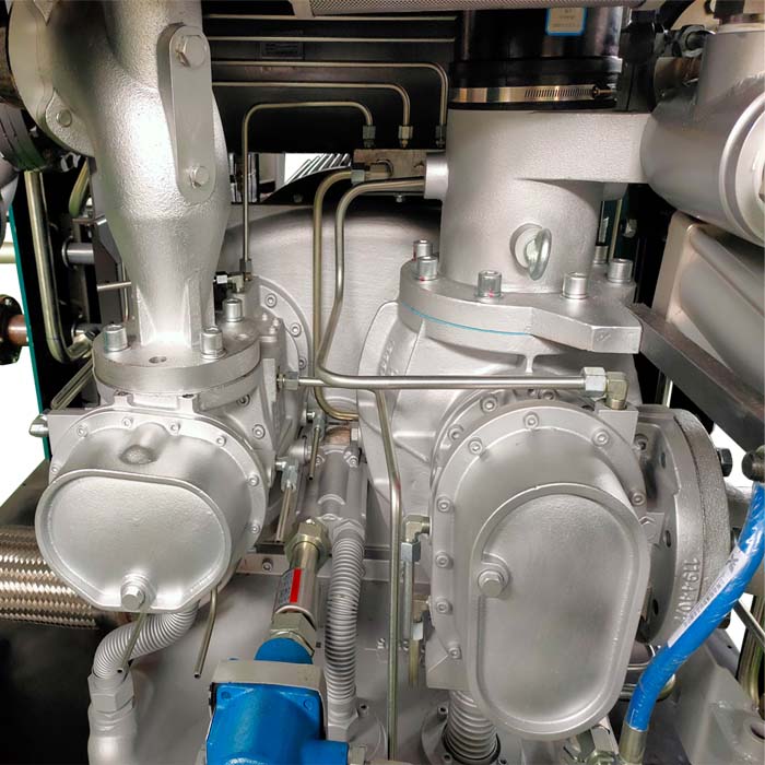 1. The air compression chamber is completely separated from the oil chamber. The air side adopts a stainless steel spring-loaded metal ring wear-free sealing system. The lubricating oil side is a wear-free sealing system with a copper labyrinth seal. The two do not contact.
